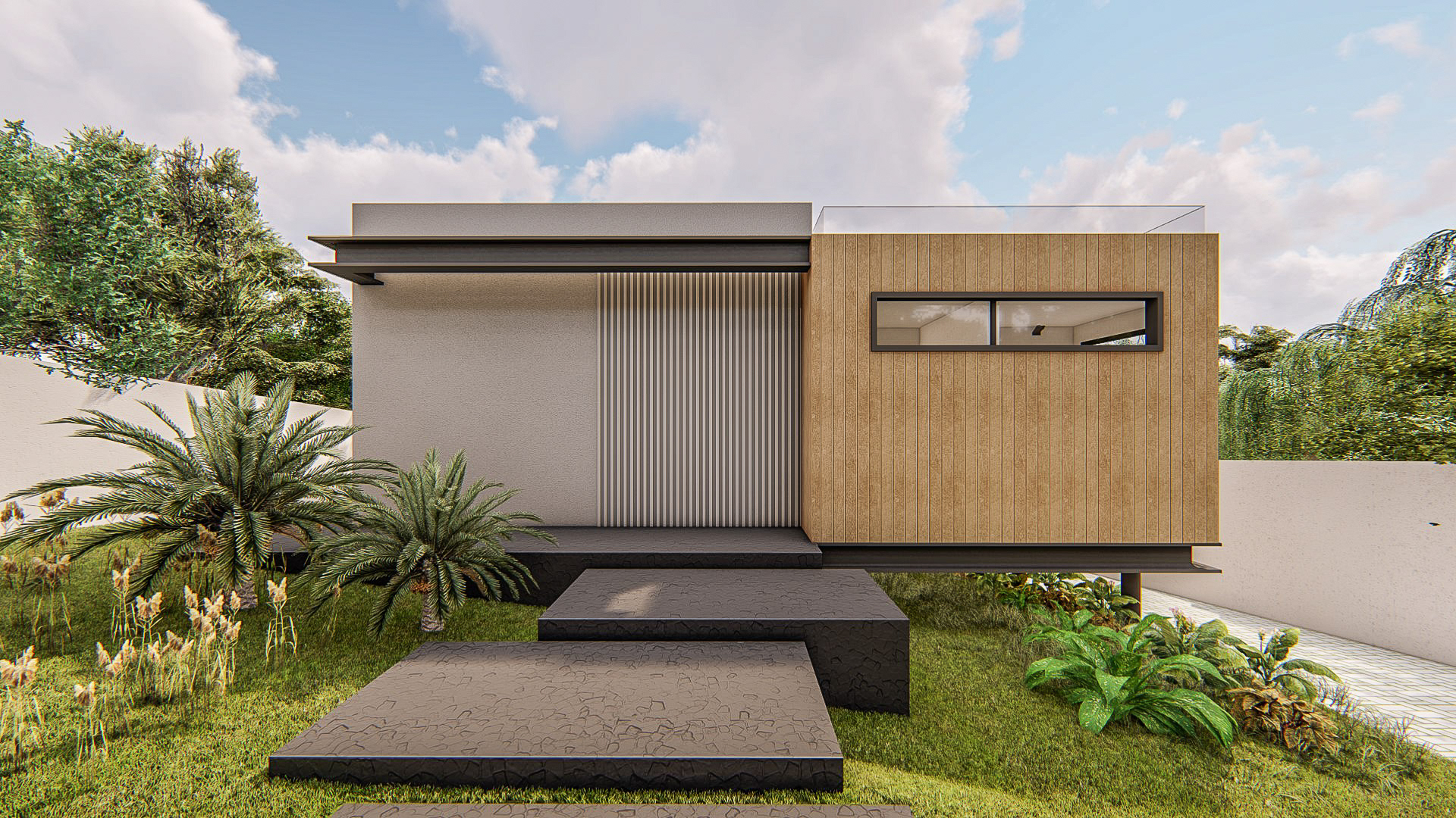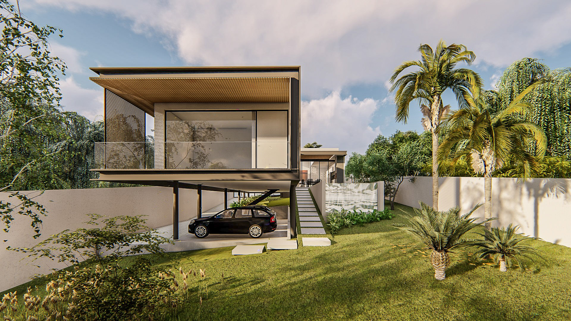 Projeto de arquitetura de residência unifamiliar de estrutura metálica em terreno em declive. 2021